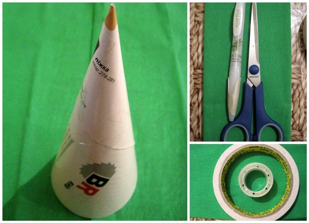 Зелеными полосками с надрезами обклеиваем конус, предварительно закрутив веточки с помощью карандаша. Любуемся работой своими руками.