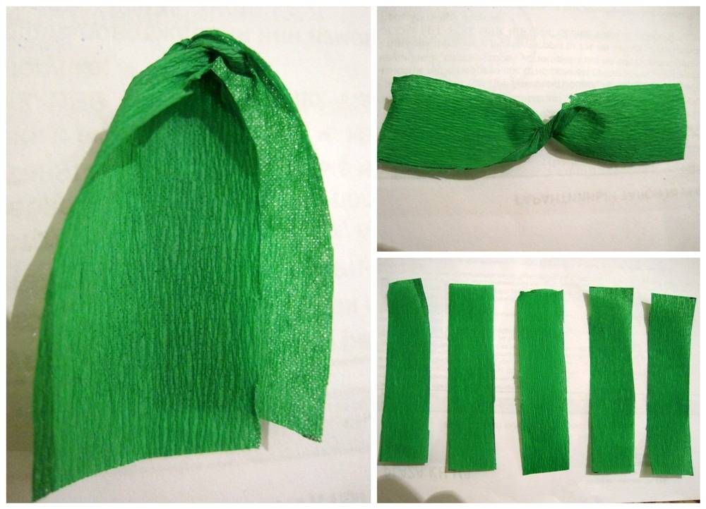- Зеленый лист разрежьте на три полоски разной ширины.