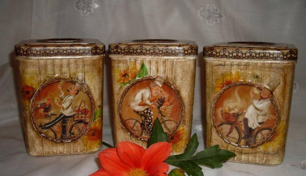 Украсить свой дом несложно при помощи подручных материалов. Стеклянные и жестяные банки, которые за ненадобностью выбрасываются, могут стать основой для создания привлекательных предметов декора. Достаточно взглянуть на фото декупажа банок, чтобы понять, что таким образом можно придать кухне уют, при этом затраты будут минимальными.
