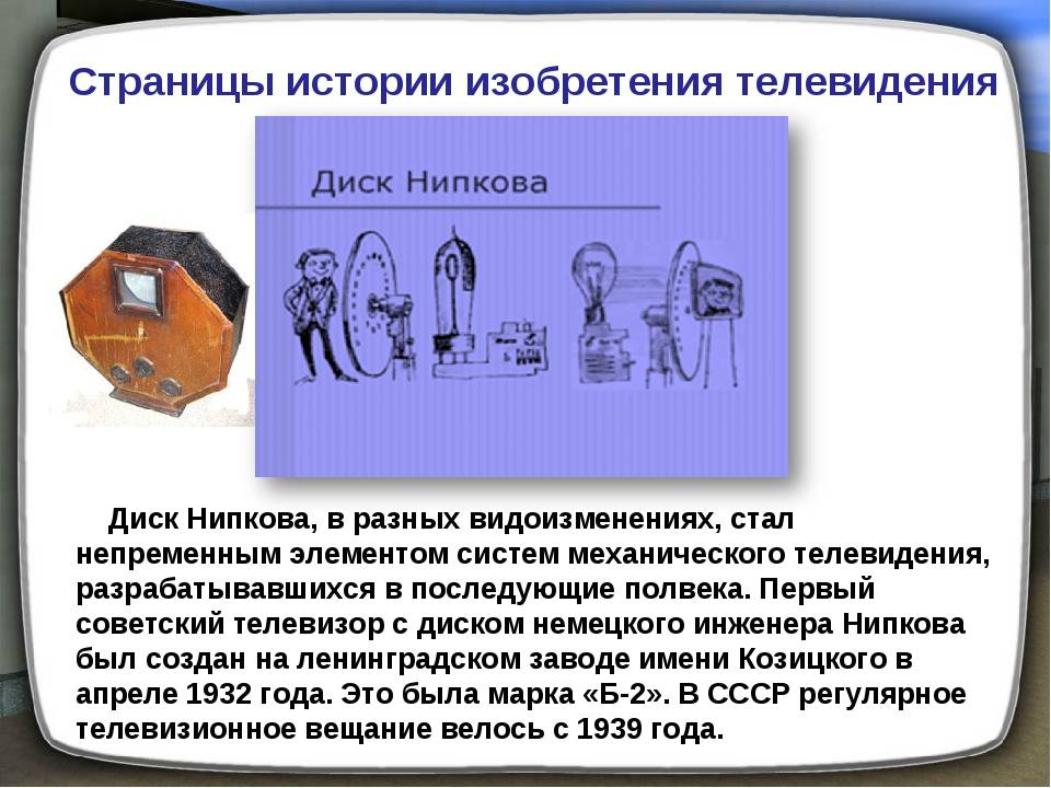 1-ое принципиальное изобретение в истории телевизоров было создано, когда германский студент Пауль Готлиб Нипков обучался в Нойштадте. Он тосковал по маме и сильно мечтал видеть её на новогодний вечер. Чтобы воплотить собственное стремление он принял решение сделать устройство по типу телефонного аппарата либо телеграфа, благо тогда они уже были. Такие рассуждения подсказали ему идею нового прибора — сканирующего диска, кот-ый в дальнейшем получил его имя.