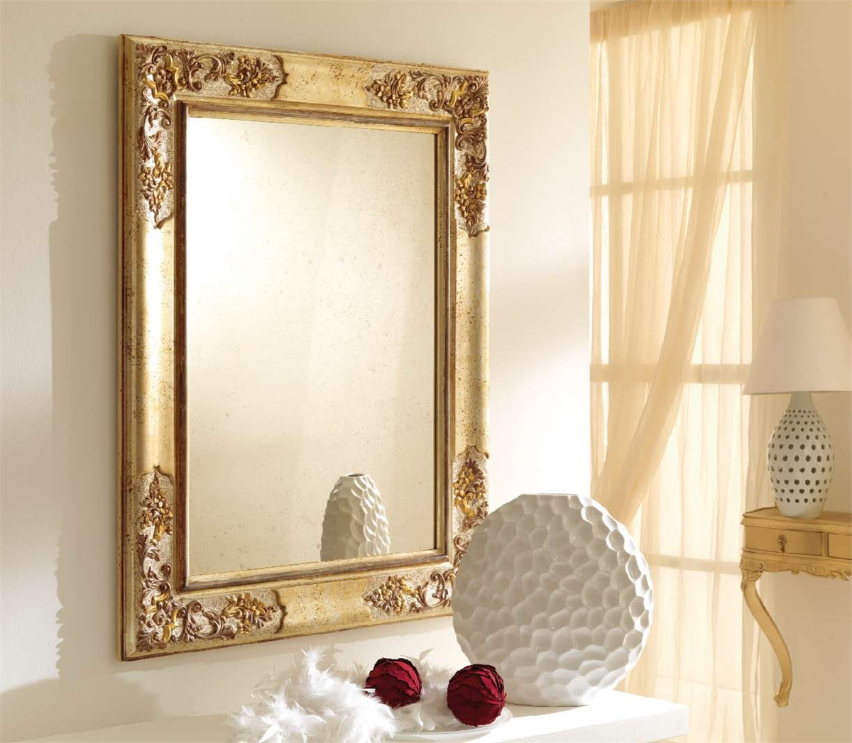 Освещение играет практически основную роль, наделяя помещение простором, чистотой, светом. При этом невозможно обойтись без его спутника – зеркала. Ведь даже мебель может быть не просто металлической, а иметь зеркальные поверхности (и речь сейчас не о банальном шкаф-купе в спальне). Так, в спальне можно сделать зеркальную дверь, которая будет опознаваться только по золотой ручке. Возможно создание эффекта множественного наличия узоров, которые отражаясь, делают интерьер комнаты визуально богаче. Дизайнеры советуют использовать максимальное количество отражающих универсальных поверхностей, бронзовые подсвечники, кованые статуэтки. Оформление предполагает огромный выбор зеркальных поверхностей – обрамленные имитированными солнечными лучами, трапециевидной формы, огромные зеркала высотой во всю стену, инструктированные кристаллами.