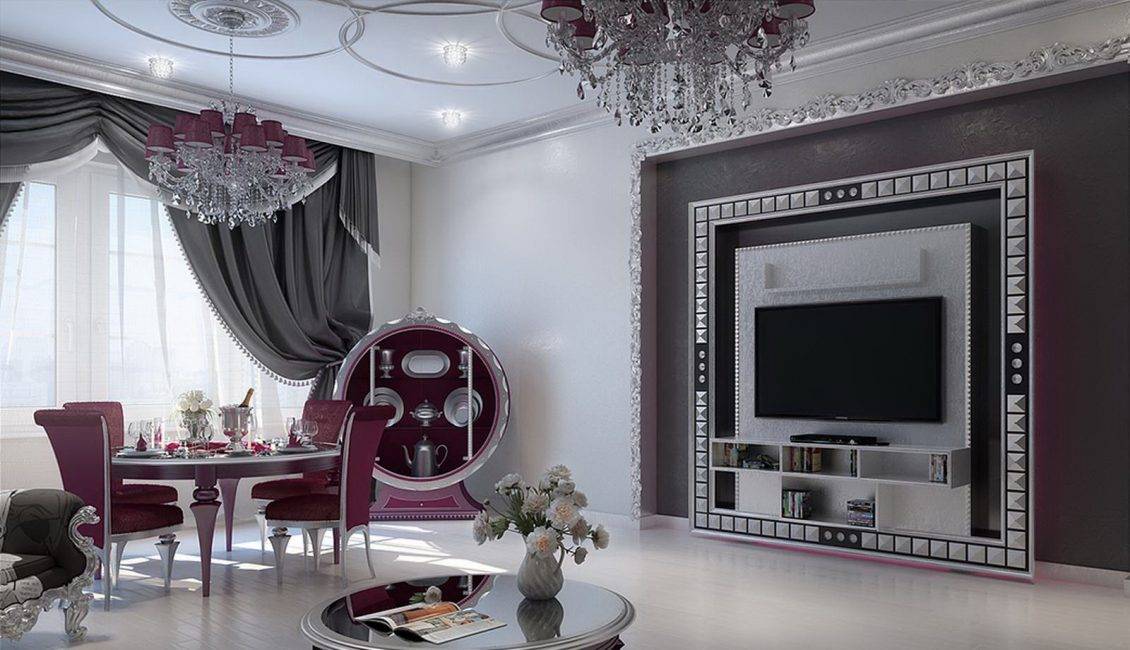 В классическом стиле. Главная задача — создать изысканную, утонченную атмосферу. Для достижения цели используется белый цвет с добавлением серых и бежевых оттенков. Незамысловатая цветовая палитра компенсируется декором: картинами, светильниками, большими зеркалами. Мебель может быть как винтажной, так и современной имитацией.