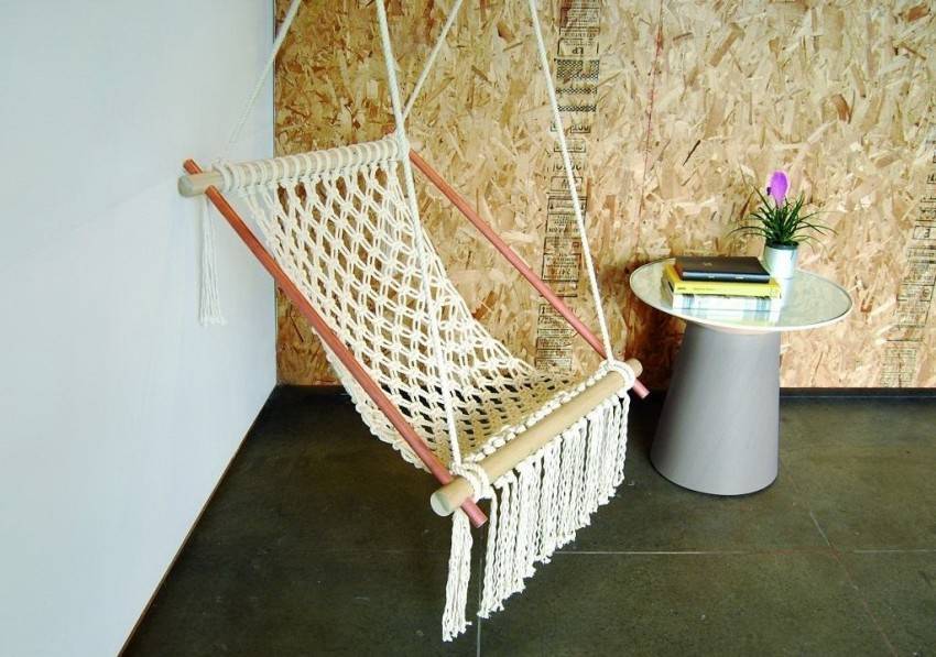- из шнуров и веревок производится плетение коконов техникой макраме, такие модели годятся для помещения и улицы.