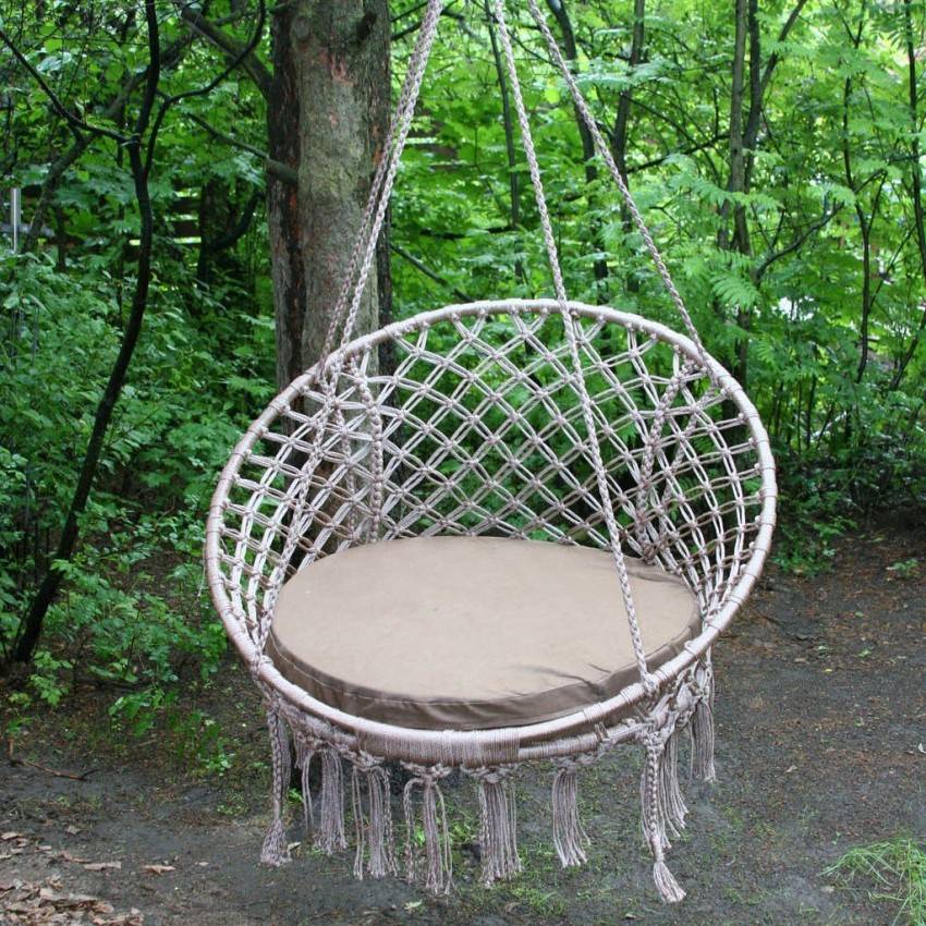 - возможность эксплуатации в любое время года. Летом садовые качели макраме вывешиваются в саду под раскидистыми деревьями, а зимой их можно подвесить в доме, квартире или на балконе.