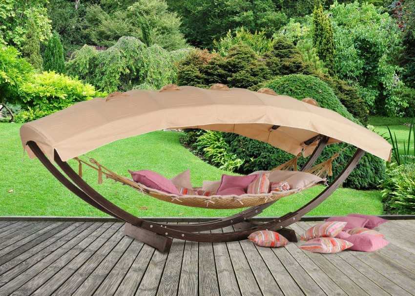 Если гамак располагается на приусадебном участке, можно дополнительно сделать небольшой навес от палящего солнца или дождя.