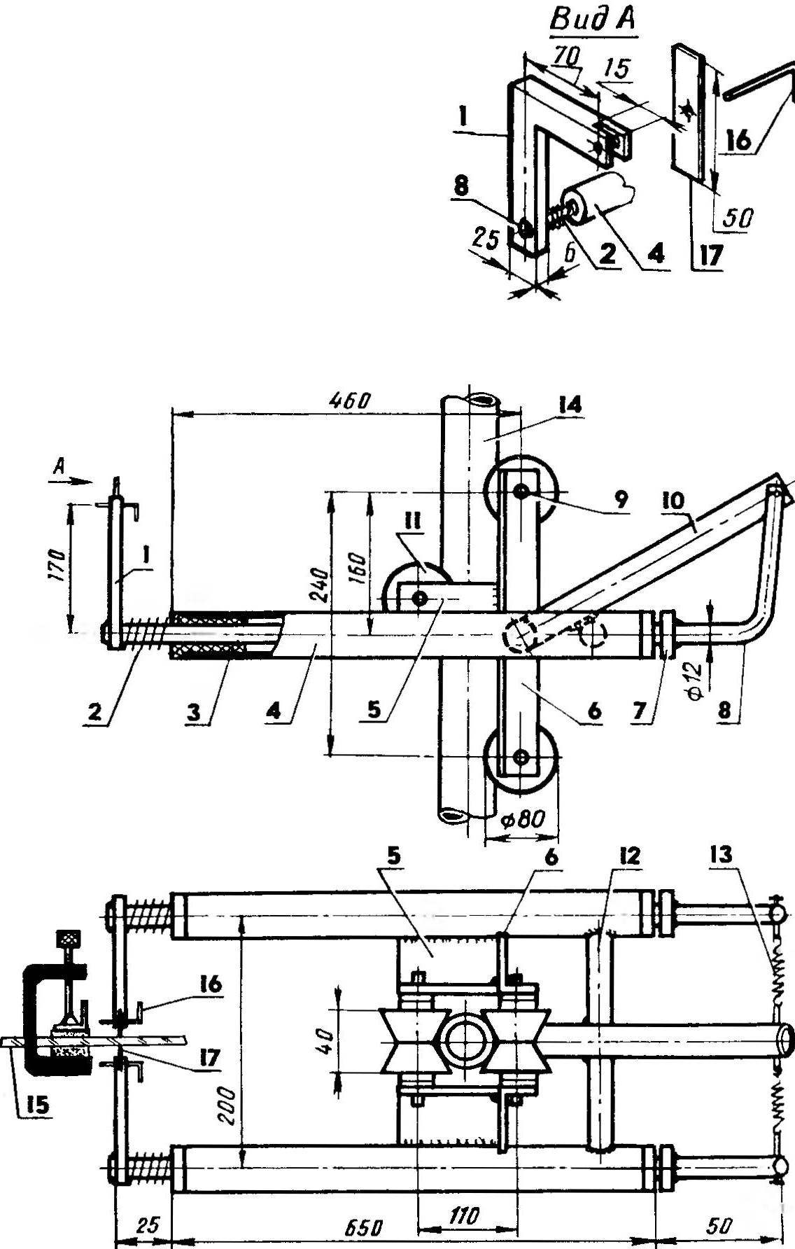1 — держатель резака (сталь, 2 шт.), 2 — пружина сжатия (2 шт.), 3 — втулка (фторопласт, 4 шт.), 4 — цилиндр (стальная труба 28×1, 2 шт.), 5 — кронштейн средней катушки (стальной уголок 45×45, 2 шт.), 6 — кронштейн верхней и нижней катушек (стальной уголок 45×45, 2 шт.), 7 — шайба (сталь, 2 шт.), 8 кронштейн держателя (стальной пруток Ø 12,2 шт.), 9 — ось катушки (болт М12, 3 шт.). 10 — кронштейн (стальная труба Ø 27), 11 — катушка (сталь, 3 шт.), 12 — поперечная связь (стальная труба Ø 27), 13 — пружина растяжения (2 шт.), 14 — направляющая станины, 15 — обрабатываемое стекло, 16 — штифт-фиксатор (стальная проволока Ø 2, 2 шт.), 17 — резак (ножовочное полотно с алмазным напылением, 2 шт.).