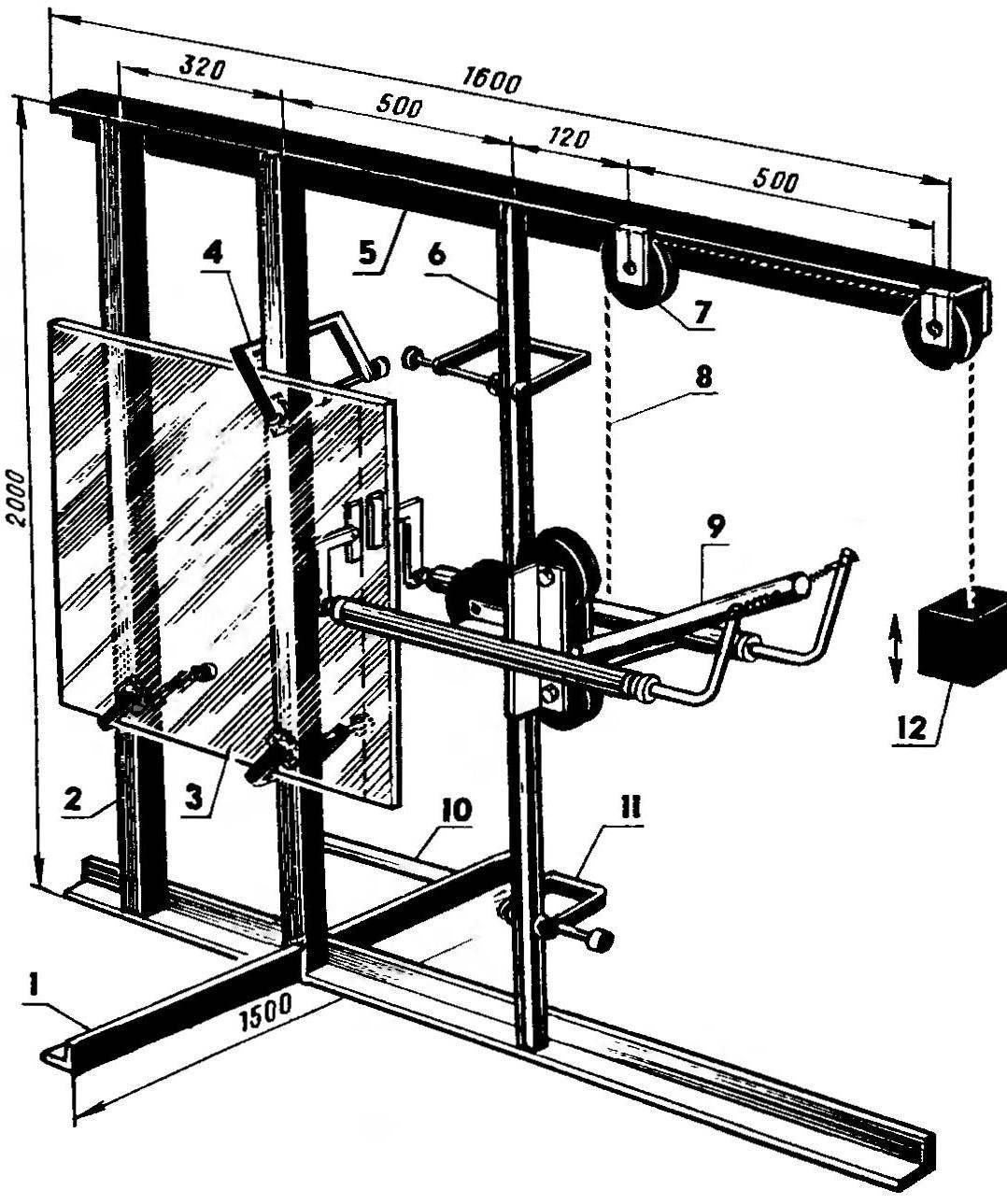 1 – горизонтальная опора (стальной уголок 50×50), 2 — вертикальная стойка (стальной уголок 50×50, 2 шт.), 3 — обрабатываемое стекло, 4 — струбцина (3 шт.), 5 — горизонтальная связь (стальной уголок 50×50, 2 шт.), 6 — направляющая (стальная труба Ø 48), 7 — шкив (сталь, 2 шт.), 8 — шнур капроновый Ø 6,9 — каретка в сборе, 10 — раскос (стальная полоса 50×2), 11 — струбцина-ограничитель (2 шт.), 12 — противовес.