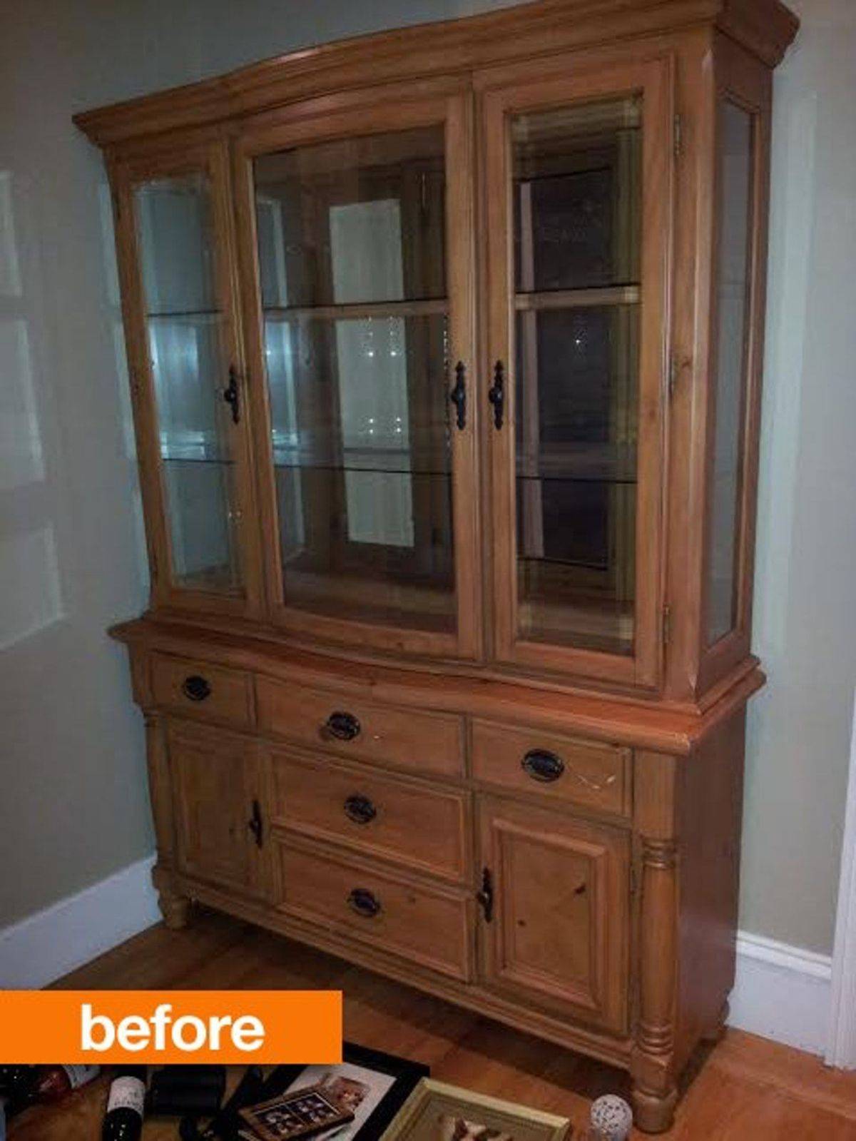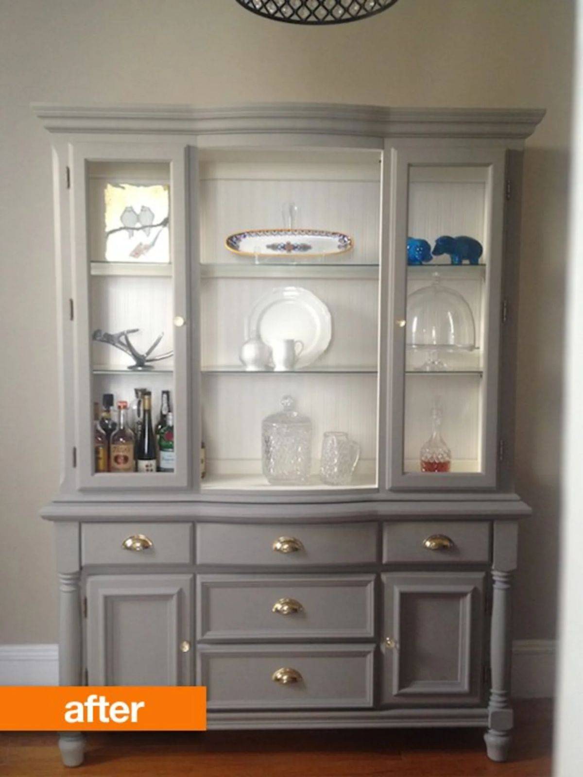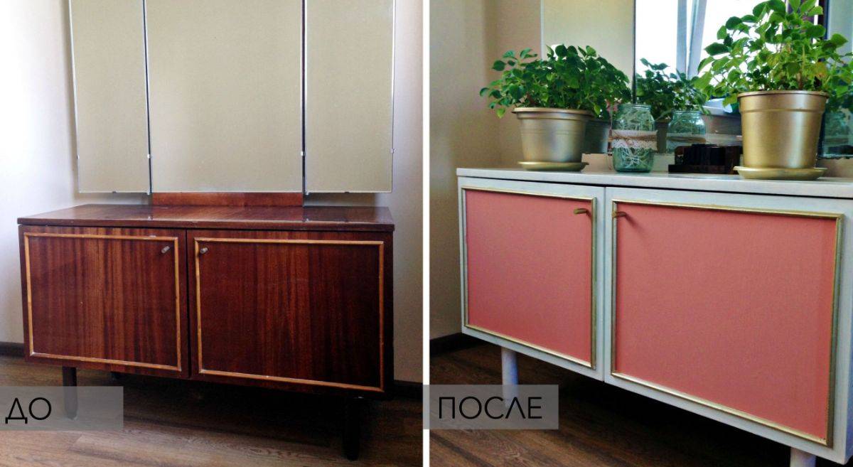 Сначала нужно снять наждачной бумагой краску и зашлифовать неровности. Фурнитуру нужно будет аккуратно отсоединить от фасадов.