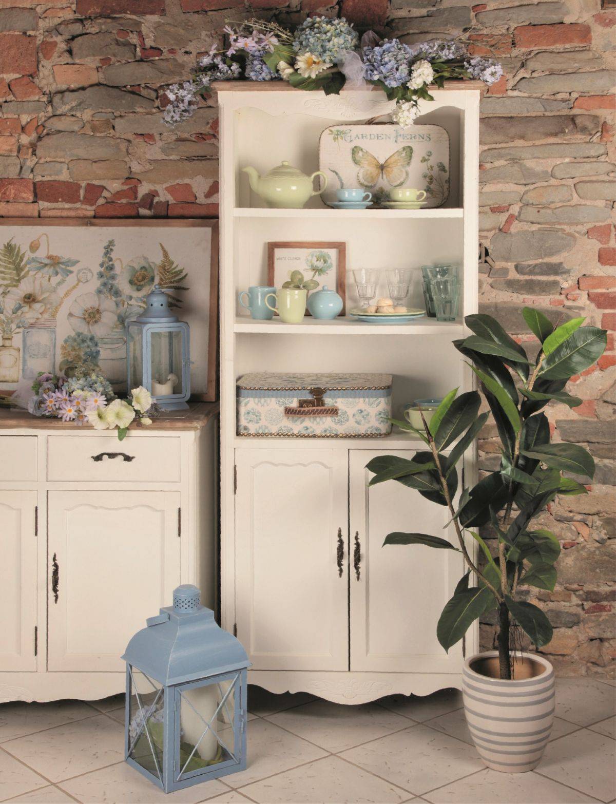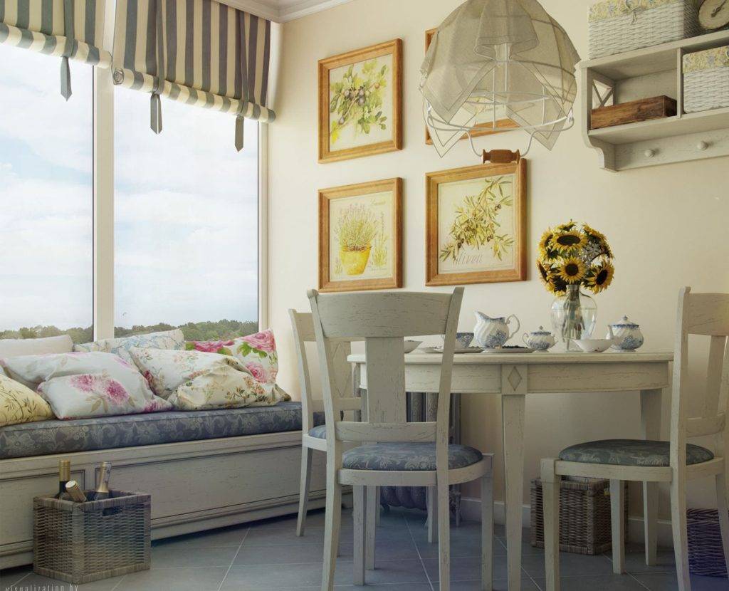 Стены украсят декоративные тарелки, картины с живописными деревенскими или морскими пейзажами, открытые полки с милыми безделушками.