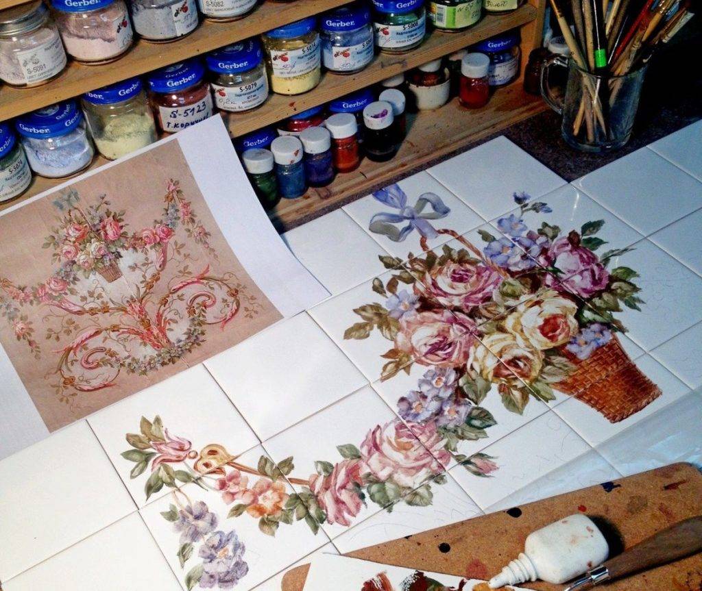 Перед нанесением рисунков плитку нужно тщательно отмыть. После высыхания ее обезжиривают ацетоном. Если для рисования узоров будет использоваться краска по керамике, то кафель не стоит обрабатывать мелкозернистой наждачкой и специальной грунтовкой. Подобные декоративные составы отлично ложатся на гладкие основания. При использовании всех остальных видов красок стоит увеличить адгезию кафеля.