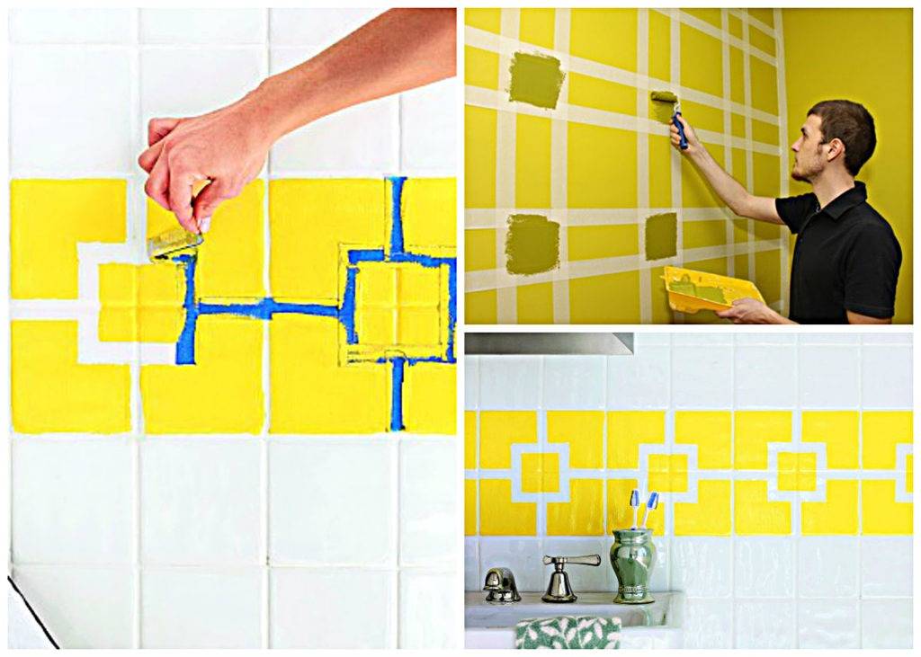 Плитку декорируют и с помощью контурных красок. Самый простой вариант — нанести точечную роспись или изобразить геометрические фигуры. Стены в ванной также полностью перекрашивают.