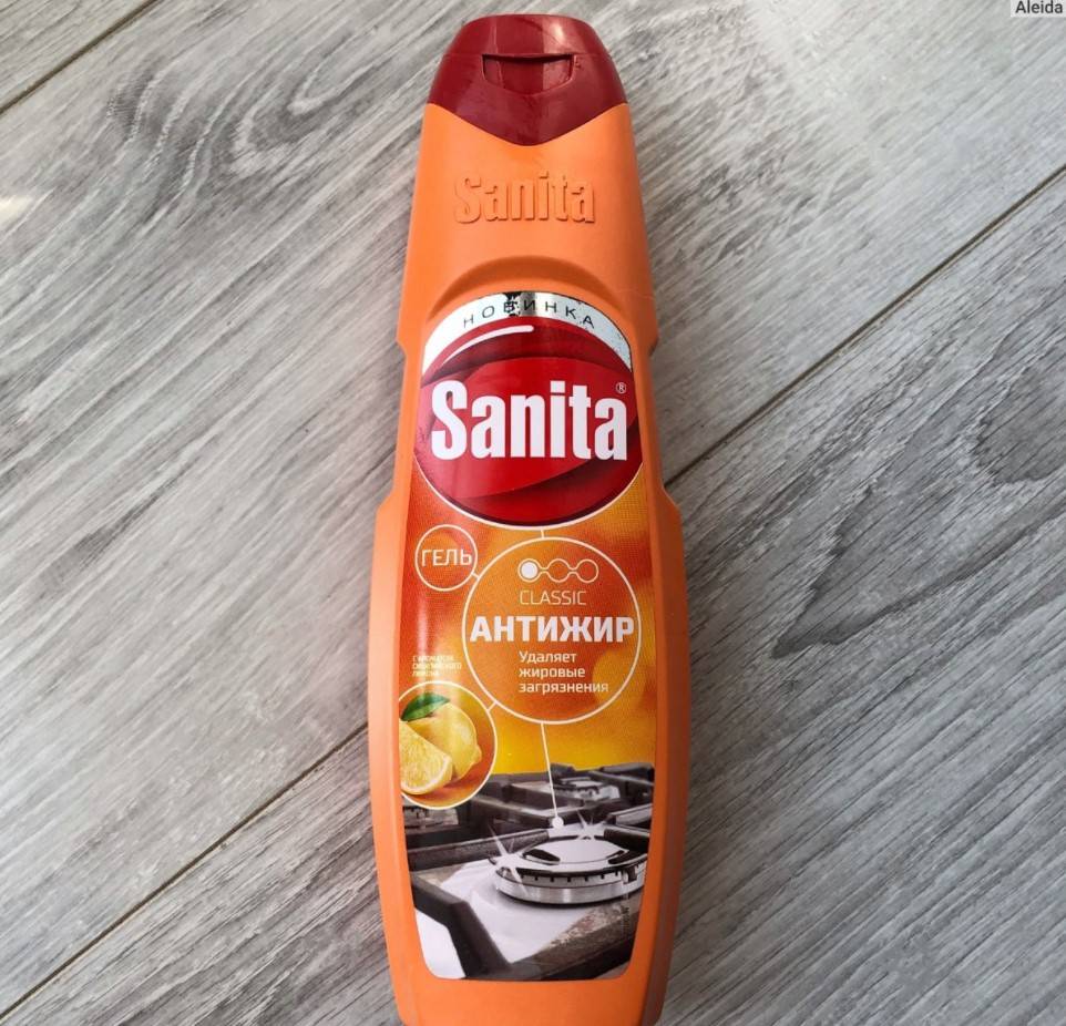 В его составе есть аммиак, а он замечательно справляется с жировыми пятнами и нагаром. Наносится губкой или распыляется с бутылки на места с загрязнениями, оставляется на ночь, а утром уже спокойно вытираете все моющим средством.