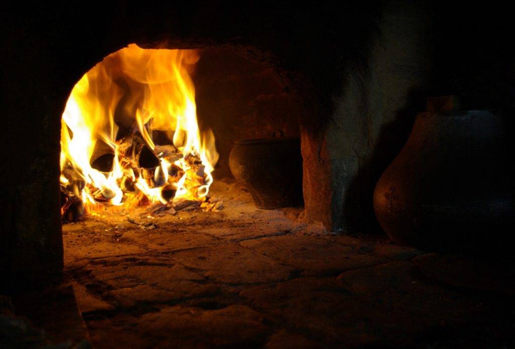 - Перед приготовлением пищи печь нужно как следует разогреть. Идеальное состояние – горячие стенки и догорающие угли.
