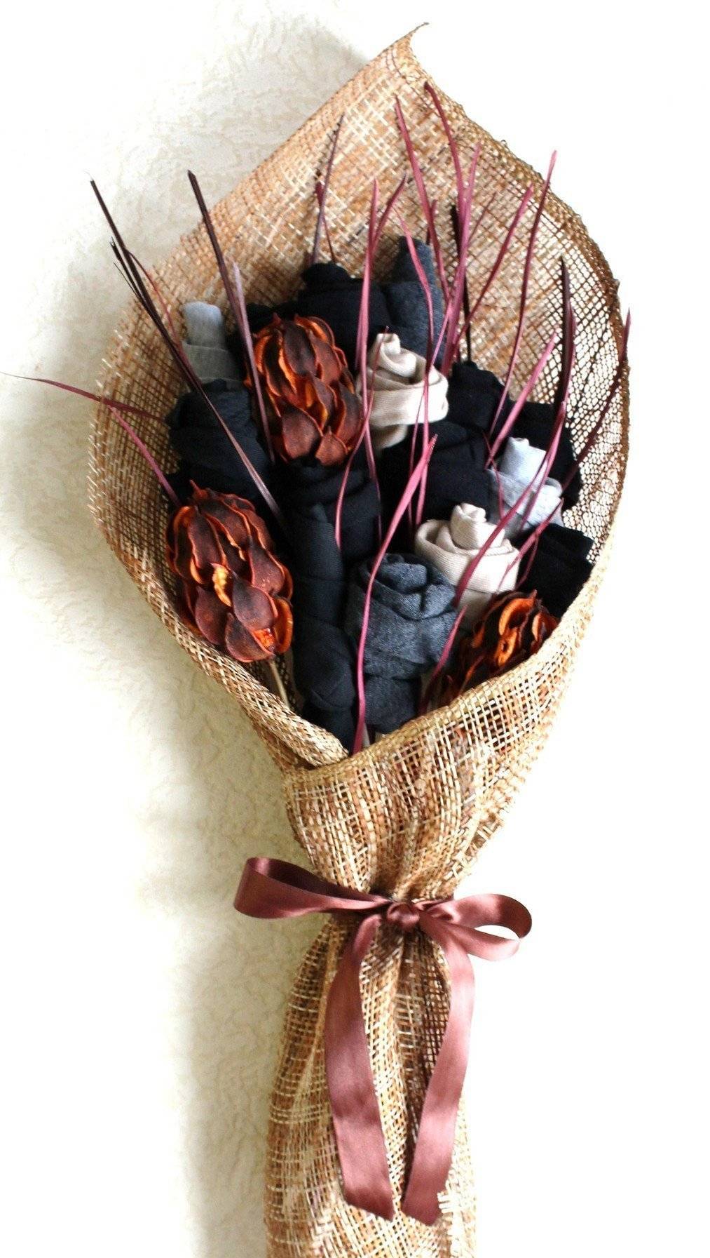 - Теперь располагаем носки вокруг футболки, создавая таким образом пышный букет и подбирая переходы цветовой гаммы. Вы можете составить однотонный букет или же сделать его пестрым – все зависит от предпочтений мужчины, которому предназначен подарок.