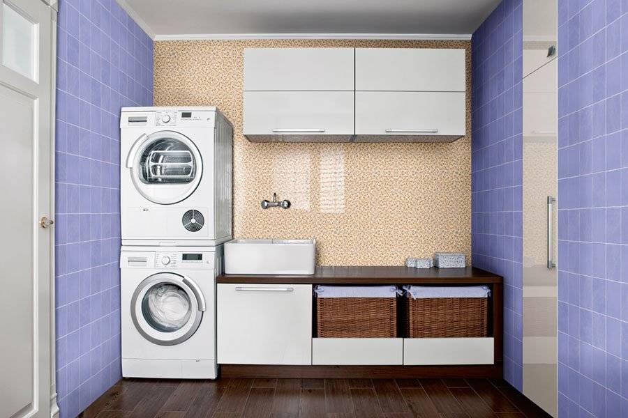 Установка рядом с отдельностоящей стиральной машиной или встраивание под столешницу. Если в помещении недостаточно места, чтобы поставить два прибора рядом, установите их в «колонну». При таком решении стиральная машина находится внизу, а сушильная — наверху. Производители предлагают различные монтажные комплекты, включающие выдвижные ящики или подставки для корзины с бельем.