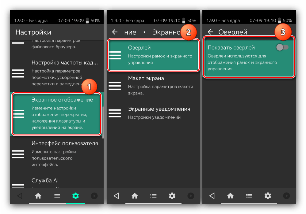 Для отключения виртуального геймпада перейдите по пунктам «Настройки» – «Экранное отображение» – «Оверлей» и задействуйте переключатель «Показать оверлей».