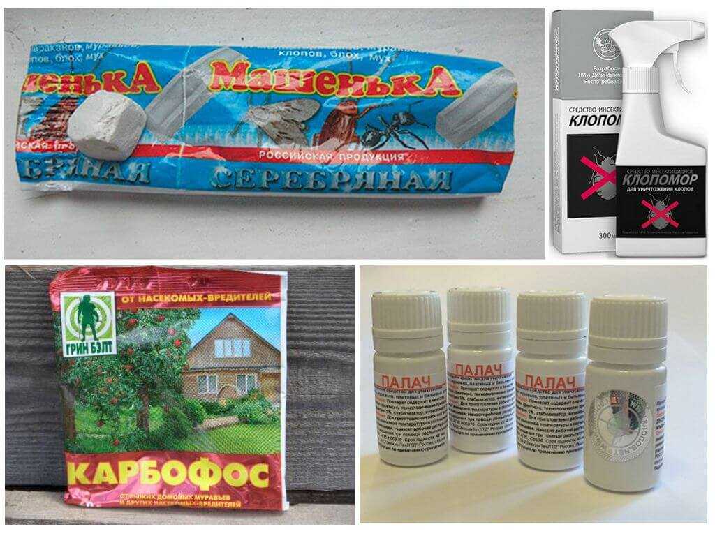 Палач — высококонцентрированный препарат, перед употреблением разводится в воде, во время обработки всех домашних животных и жильцов лучше удалить из квартиры, а двери и окна герметично закрыть, Клопомор — один из самых эффективных спреев, обладает высокой токсичностью для насекомых и поэтому при его использовании следует применять защитные меры (одежда, респиратор, перчатки), Карбофос — средство, которое с высокой эффективностью убивает взрослых клопов, их яйца и личинки, однако требует осторожности при применении, Мелок Машенька — удобный для нанесения в зонах обитания паразитов и предполагаемых гнезд для их уничтожения. Также хорошо зарекомендовали себя следующие средства: