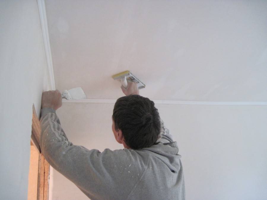 - При необходимости потолок выравнивается, все трещины на нем шпатлюются.