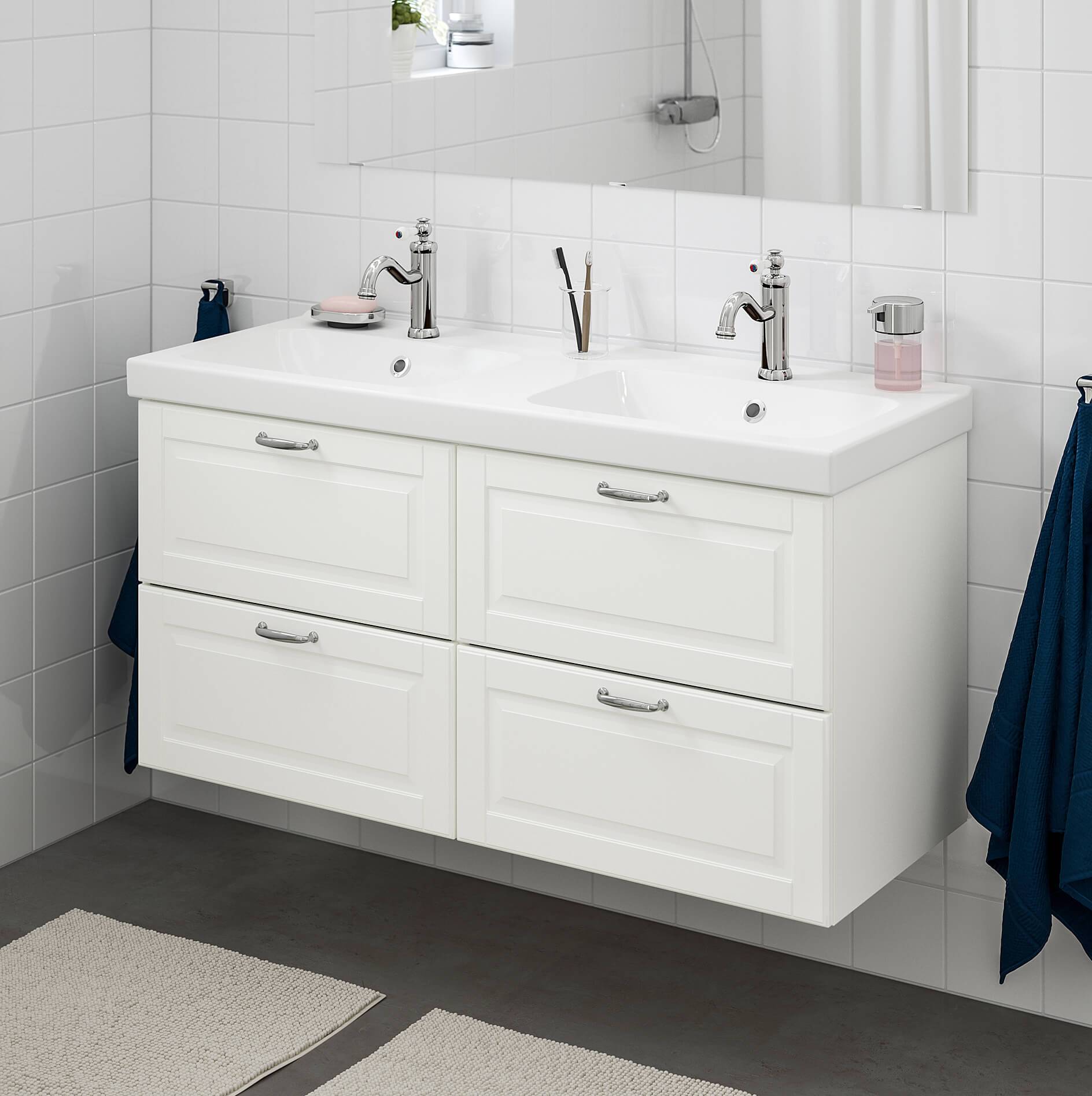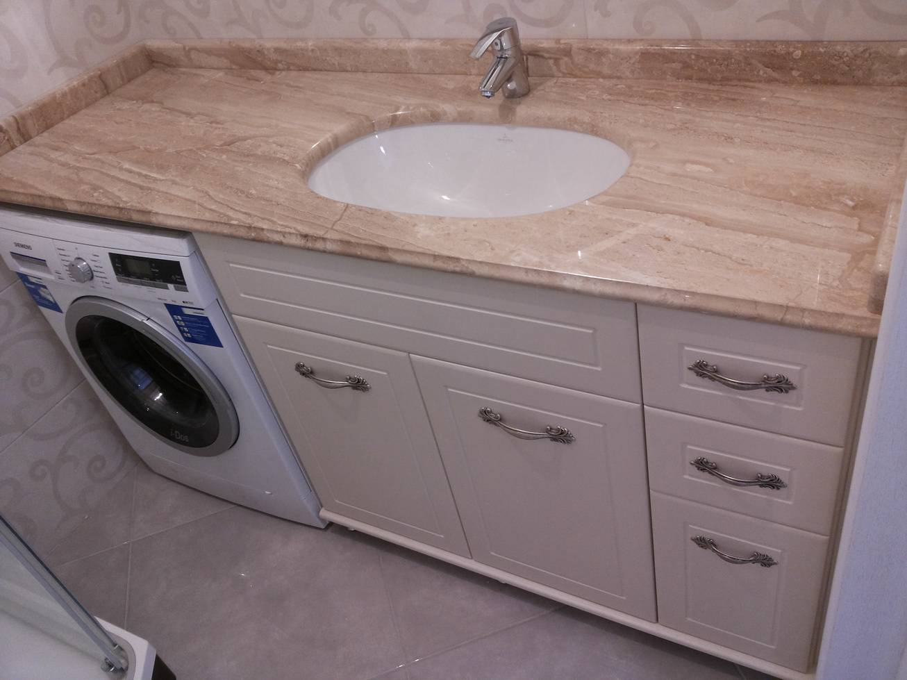 - Заодно стоит подумать о вертикальных размерах тумбы и использовании свободного пространства под ней. Например, некоторые предпочтут маленькую тумбочку, чтобы внизу установить стиральную машинку, корзину для белья или небольшую выдвижную ступеньку для ребенка.