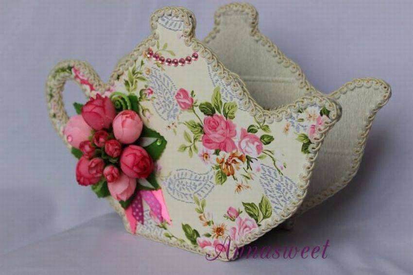 Выбирая аксессуар для себя или в подарок, ориентируйтесь на имеющиеся в доме чайные сервизы. Для чашек керамической группы можно купить вазочки из фарфора белого цвета с нейтральным декором или перфорацией. Красиво смотрятся корзиночки с красноречивым чайником.