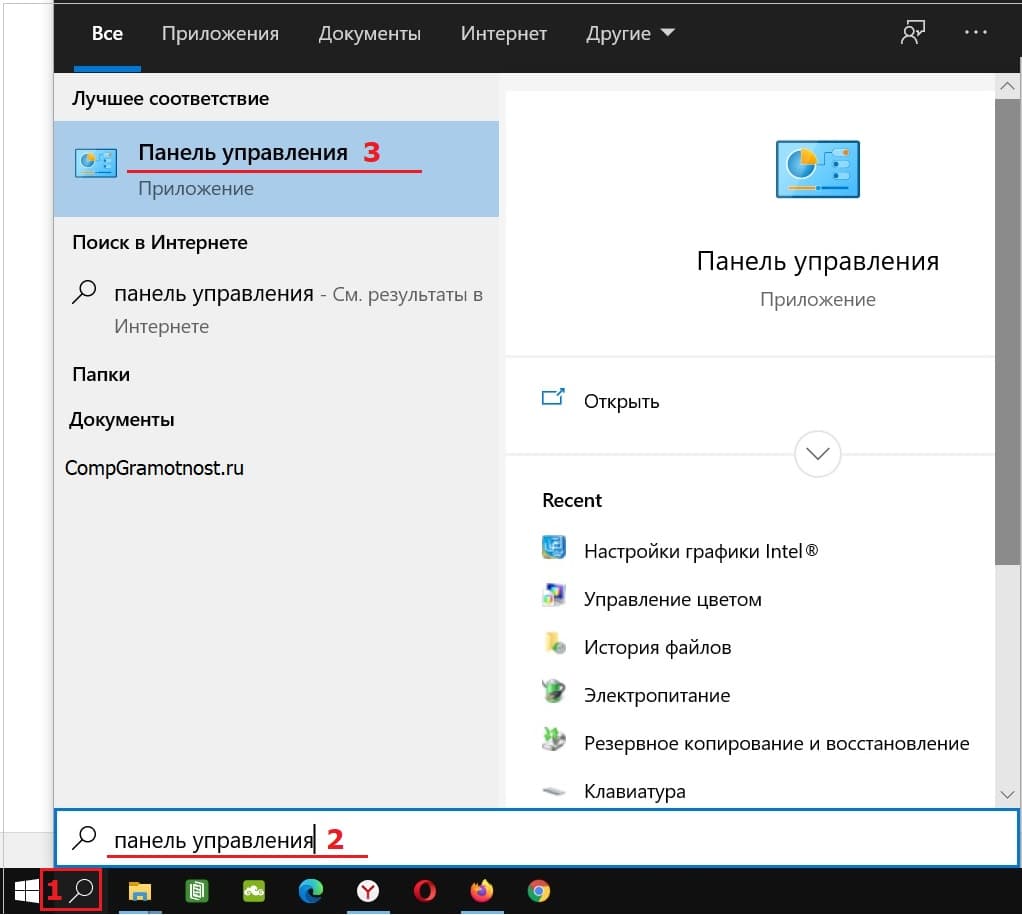 Далее в строку поиска необходимо ввести: Панель управления (2 на рис. 4). Затем остается кликнуть на «Панель управления» (3 на рис. 4).
