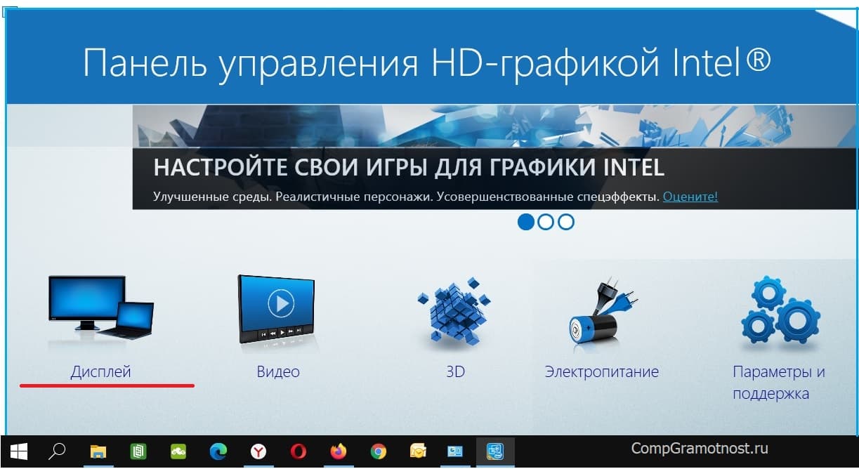 Рис. 6 (Кликните для увеличения). В окне «Настройки графики Intel» открываем вкладку «Дисплей».