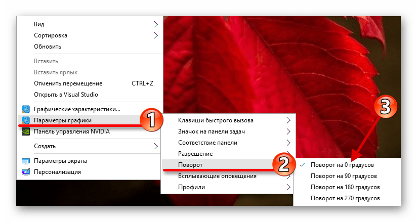 Чтобы придать изображению нужную ориентацию необходимо нажать комбинацию клавиш Ctrl + Alt + стрелка нужного направления поворота, в нашем случае — вниз. Открывать окна настроек не требуется.