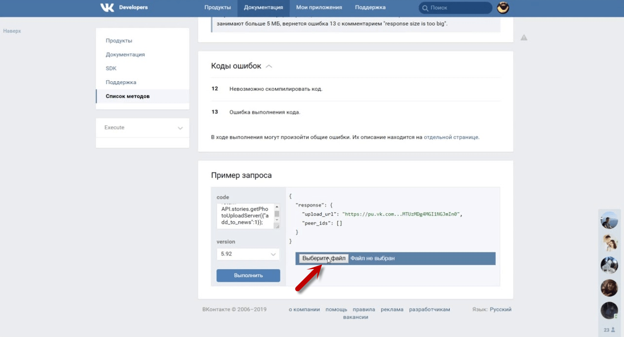 - Пролистайте страничку вниз, пока не увидите поле «Пример запроса». Чтобы добавить публикацию в соцсеть, вам необходимо скопировать код для истории в поле code.