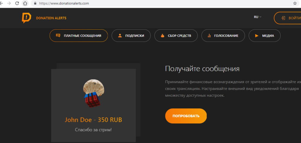 Авторы имеют возможность получать пожертвования: если пользователь хочет поддержать стримера, он может кликнуть под плеером по кнопке — «Поддержать», указать перечисляемую сумму и текст передаваемого стримеру сообщения, после чего «донат» появится в прямом эфире. Кроме пожертвований, в трансляцию можно выводить уведомления о новых подписчиках и репостах.