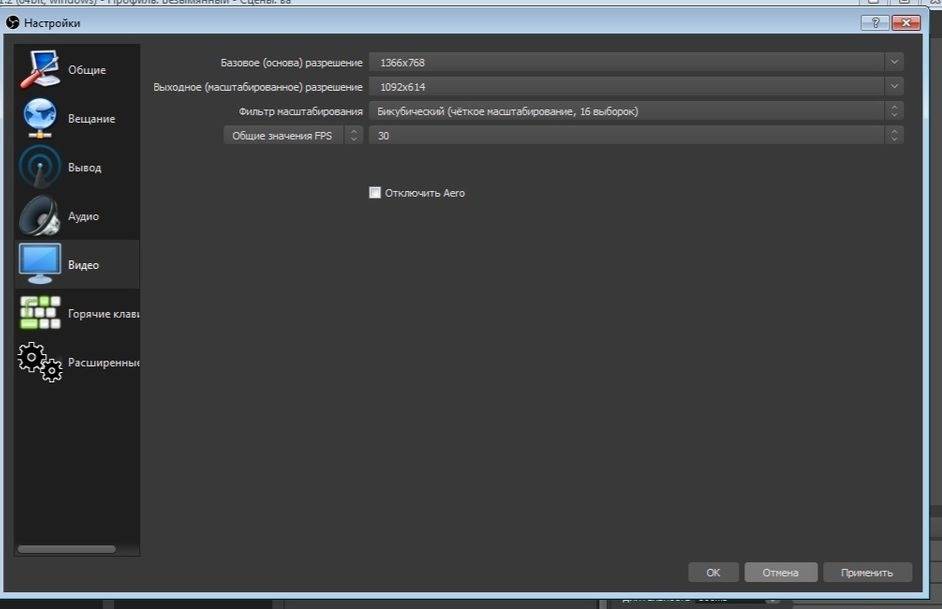 13. В разделе «Видео» выберите следующие параметры:Базовое разрешение — без изменения;Выходное (масштабированное) разрешение — в зависимости от мощности компьютера и скорости доступа в Интернет;