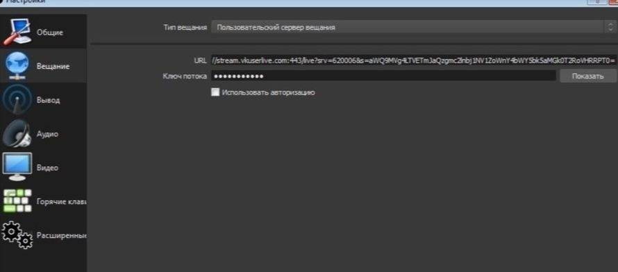 10. Скопируйте ссылку и ключ потока (никому не сообщайте их!) трансляции ВКонтакте из п.6 в поля «URL» и «Ключ потока»;