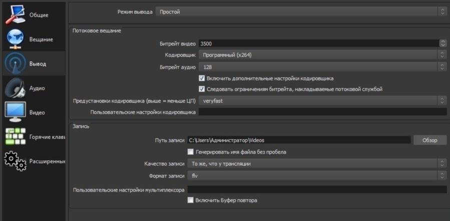 11. Откройте вкладку «Вывод», выберите битрейт видео в поле «Видео битрейт», выберите пункт «Программный (x264)» в поле «Кодировщик»: в поле «Аудио битрейт» установите битрейт звука равным 128, включите дополнительные настройки кодировщика и убедитесь, что в меню «Предустановки кодировщика» выбран параметр «veryfast».