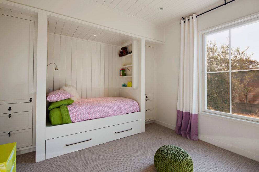 - Детская – если в доме есть дети, в такой нише часто создают зону для них. Небольшая кроватка полностью помещается в углублении. Она может быть двухъярусной. Кровать-чердак позволит организовать удобное хранение игрушек, книг и канцелярских принадлежностей. Под кровать можно поставить детский транспорт или кукольный домик;