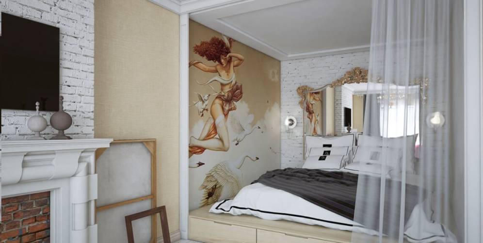За счет интересного оформления просматриваемой стены в алькове, в виде зеркал, тематических картин или другого декора, предоставляется возможность задать обстановке особое настроение и придать пространству визуальной глубины.
