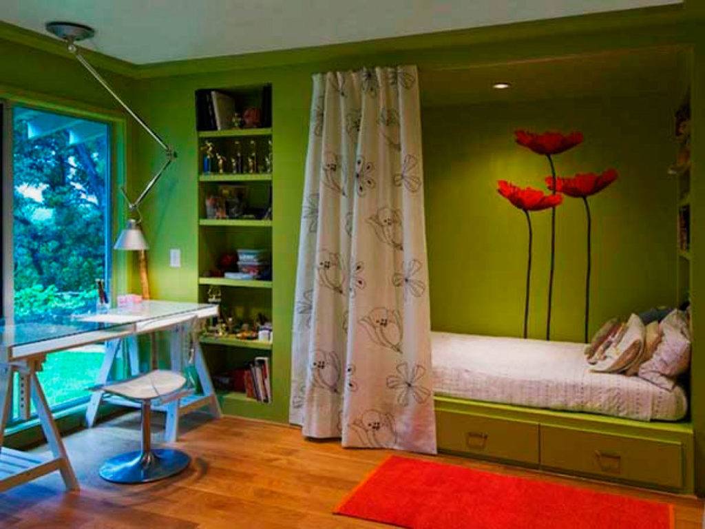 Такое декораторское решение является самым простым, шторный ансамбль, не только значительно украшает обстановку, но и отлично скрывает спальное место от посторонних взглядов и защищает от пыли.
