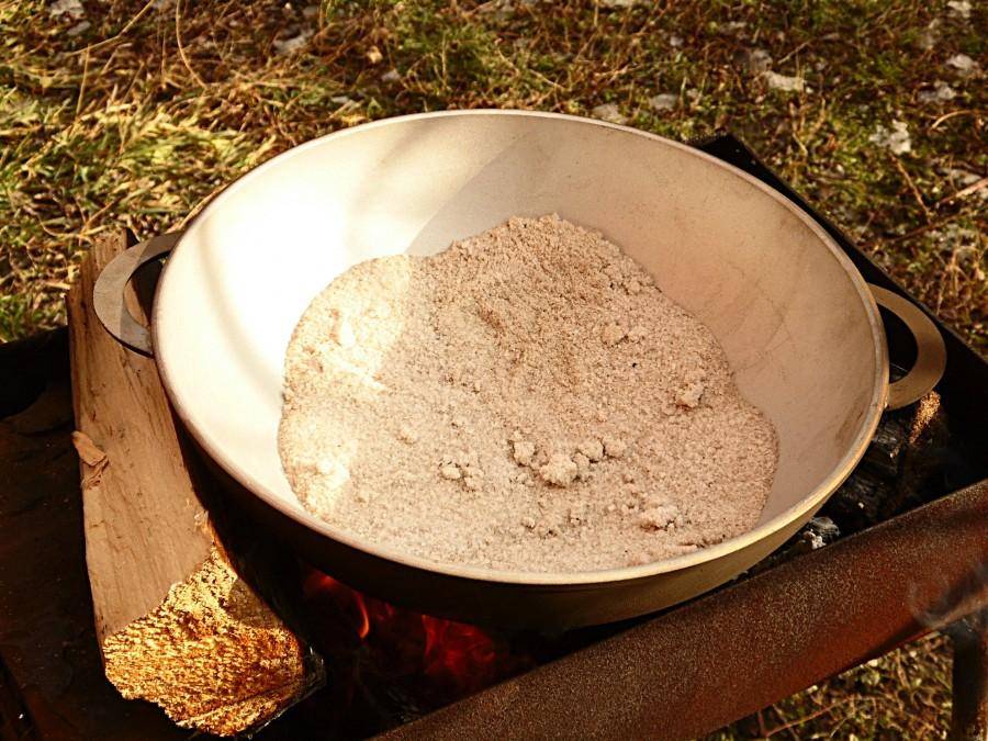 Емкость поздно вечером надо полностью заполнить песком, поставить на медленный огонь и можно идти спать. Утром останется высыпать песок, протереть казан бумагой и ополоснуть посуду.