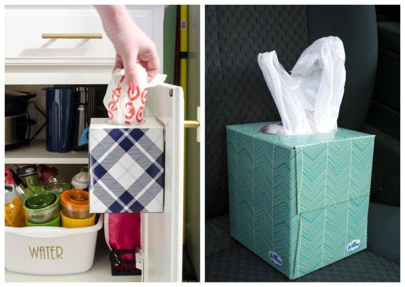 Такую коробку для пакетов можно поставить на стол или прикрепить к горизонтальной поверхности, на двухсторонний скотч.