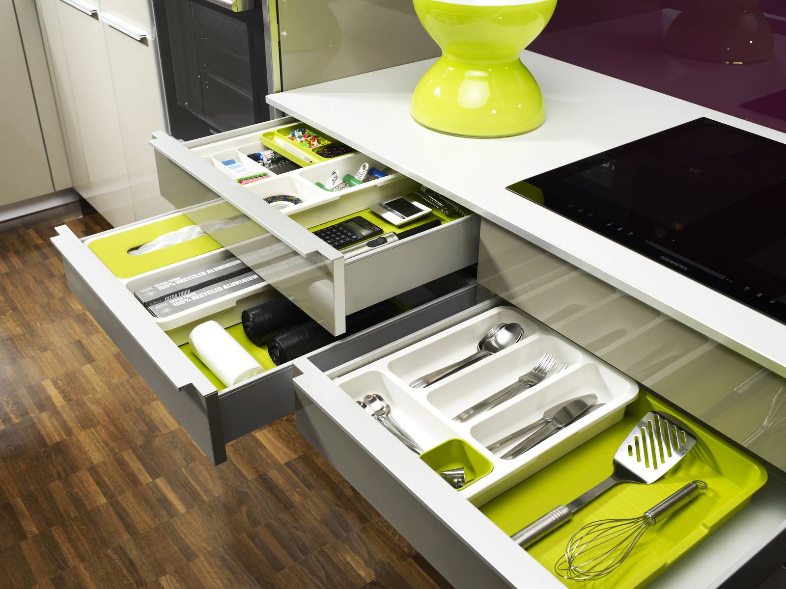 Кухонные ящики любых размеров и глубины — еще одна горячая точка беспорядка. Используйте в них наборы вставок и наводите порядок одним движением. Сортируйте формы для выпечки и кексов, кухонные аксессуары, губки и полотенца.