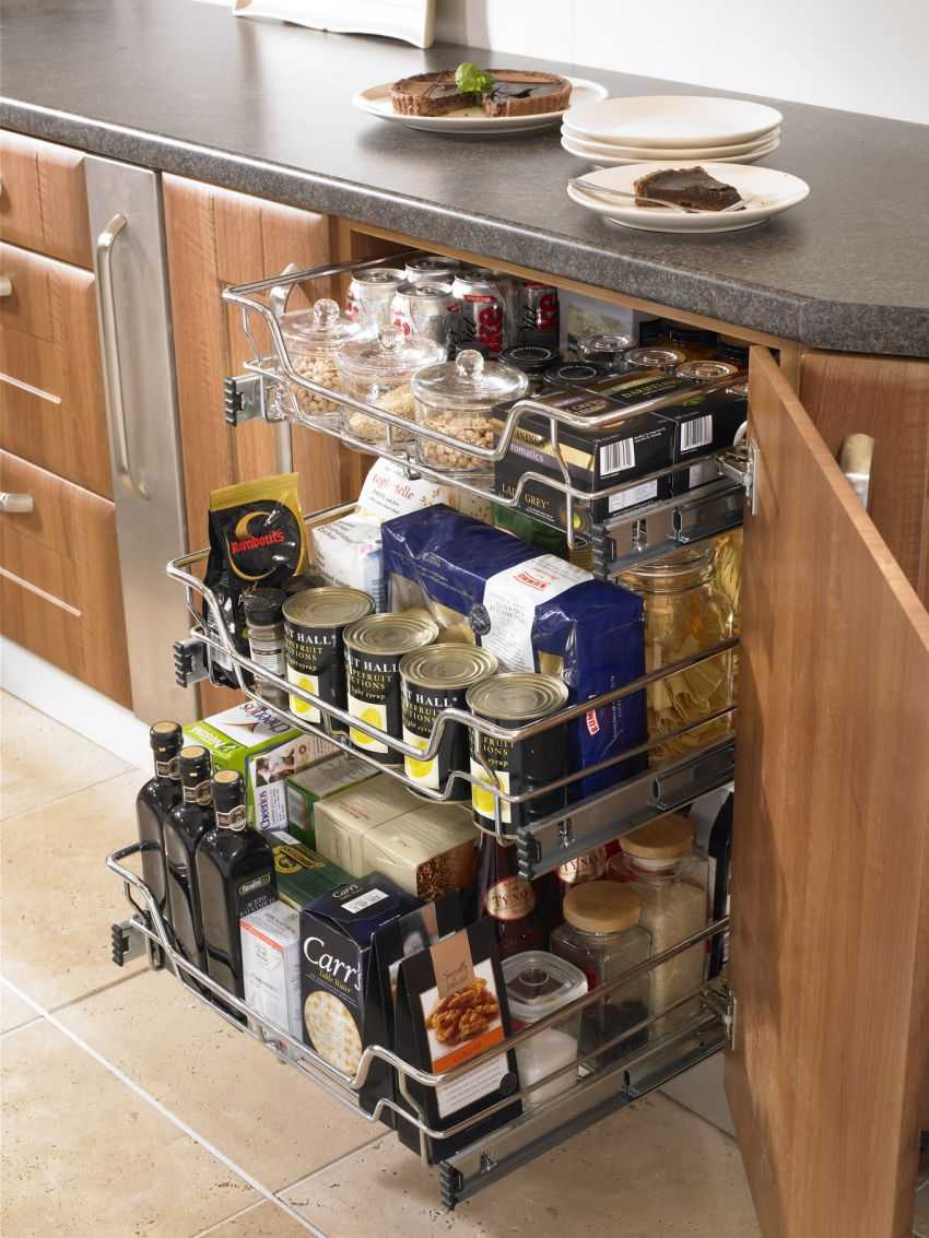 Чаще всего это вертикальный стеллаж, который отведен под хранение мелкой бытовой техники и крупногабаритной посуды — противней, форм для выпечки, мясорубок.