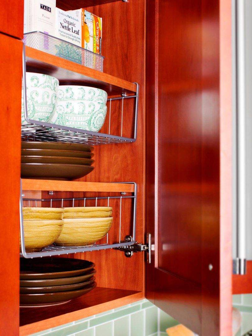 Разделителями можно укомплектовать шкафы и отсеки кухонной мебели разных габаритов. Такая система хранения подходит как для мелочей, так и для крупных вещей.