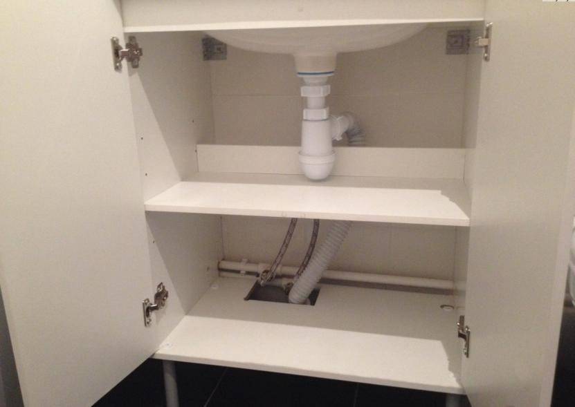 - Чтобы добавить места под раковиной, используйте выдвижной ящик, который не будет касаться коммуникаций.