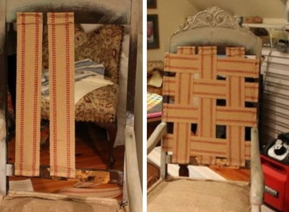 Если старые стулья изготовлены с применением ленты из брезента, нужно достать прорезиненные ремни аналогичной ширины. Их следует укрепить по центру бруска. Сперва полоску нужно закрепить скобами, повернуть, снова укрепить, натянуть и закрепить со второй стороны. Сверху необходимо установить мягкую подложку. Для работы потребуются безмен, специальный мебельный степлер.