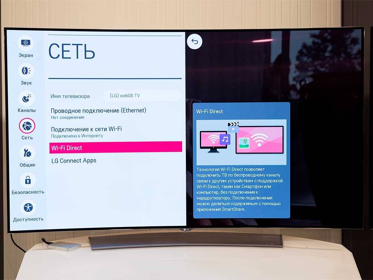 - Зайти в настройки «Сеть» телевизора и найти пункт Wi-Fi Direct.