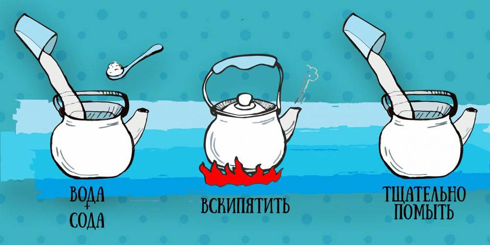 1. Пищевая сода. Четыре ложки соды соединяем с водой, после чего нужно обязательно довести ее до кипения, и дать остыть. Сливаем воду, удаляем остатки въевшейся накипи и окончательно промываем чайник до полной очистки проточной водой.