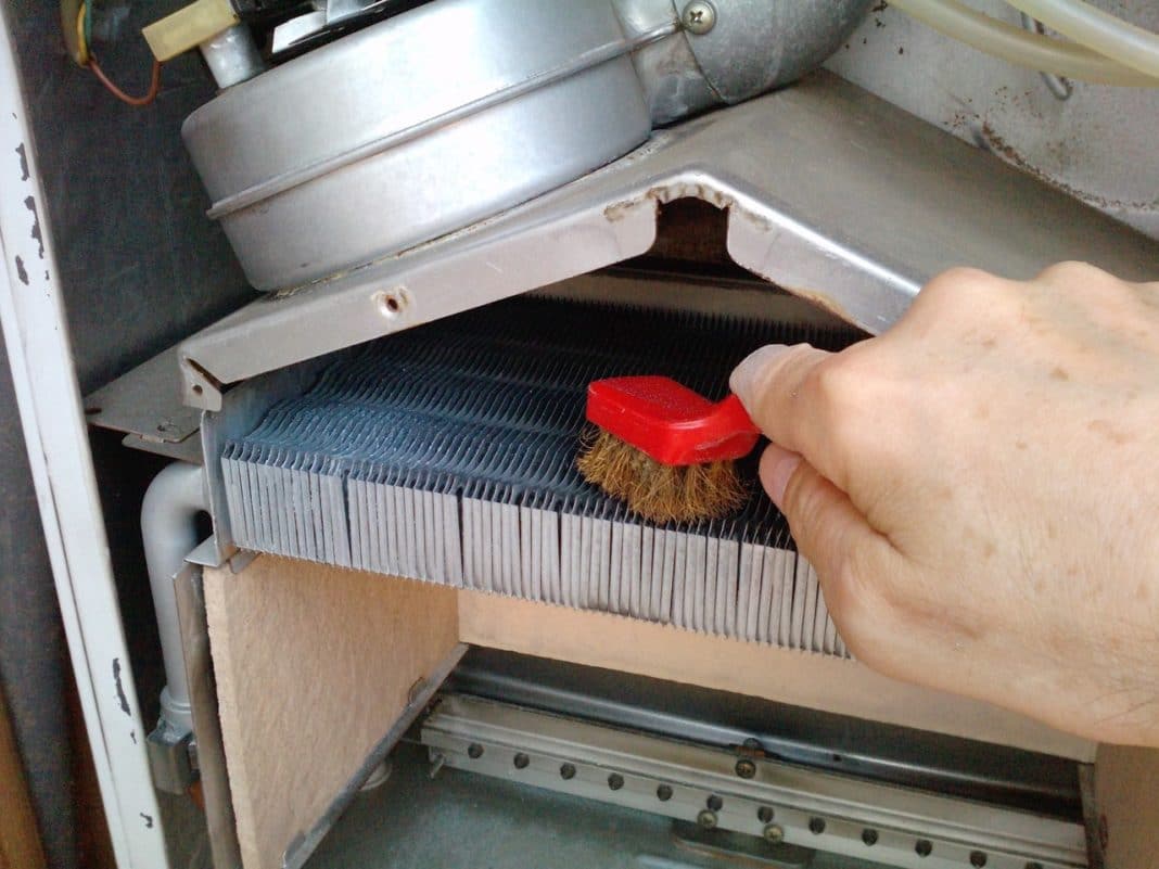 Все элементы теплообменника, внутренние и внешние, необходимо вычистить жесткой щеткой по металлу. Осевшую пыль и остатки извести удобно удалять пылесосом и влажной тряпкой