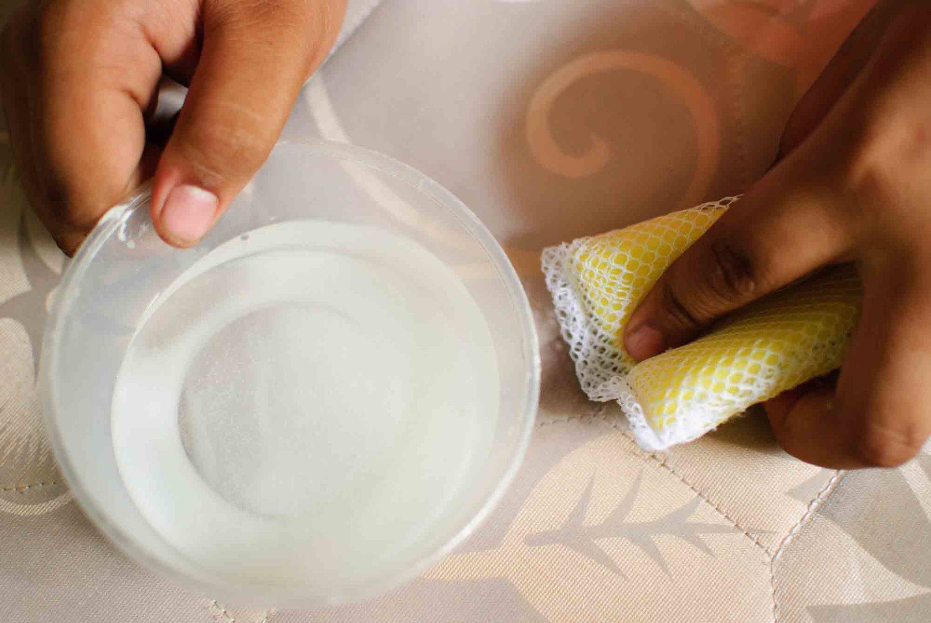 - Вариант №1: соедините компоненты в равных пропорциях, нанесите на пятно, ожидайте 1 час, и можно оттереть влажной (не мокрой) губкой.