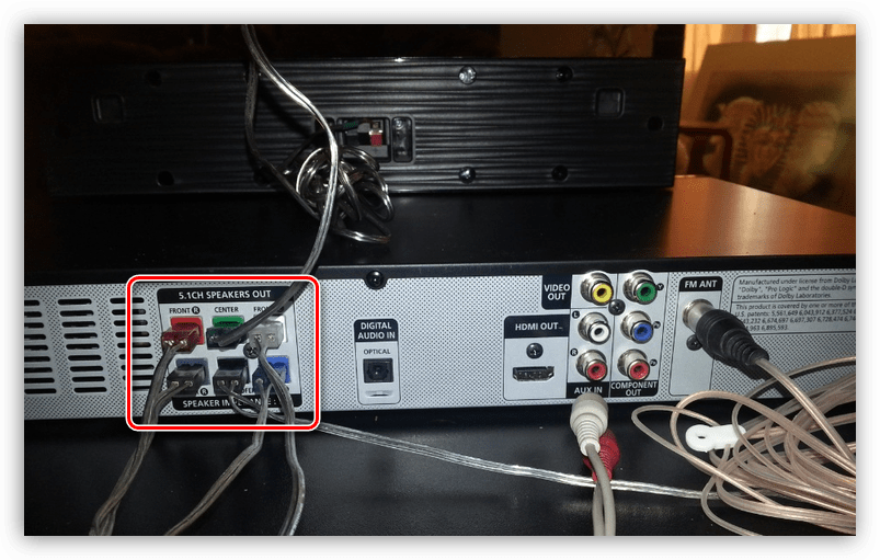 Колонки, в свою очередь, включаются в соответствующие гнезда на DVD.
