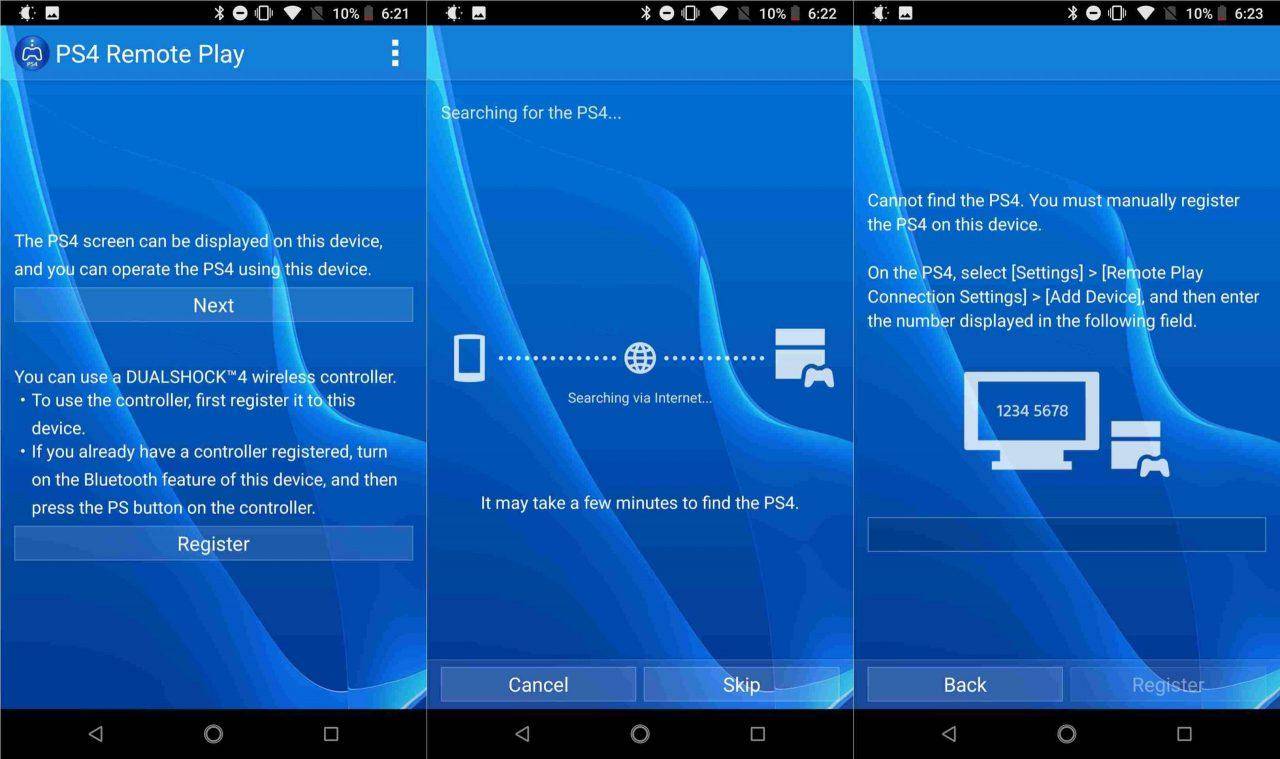 Скачать приложение «PS4 Remote Play», а затем установить его на смартфон. При уведомлении о необходимости регистрации геймпада, следует выбрать «Skip», чтобы выполнить регистрацию эмулятора позже.