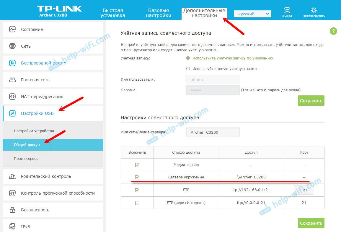 На новых роутерах, с новой панелью управления нужно в разделе “Дополнительные настройки” открыть вкладку “Настройки USB” – “Общий доступ”. Мы получали доступ через “Сетевое окружение”. Как видите, его можно отключить, просто убрав галочку возле него.