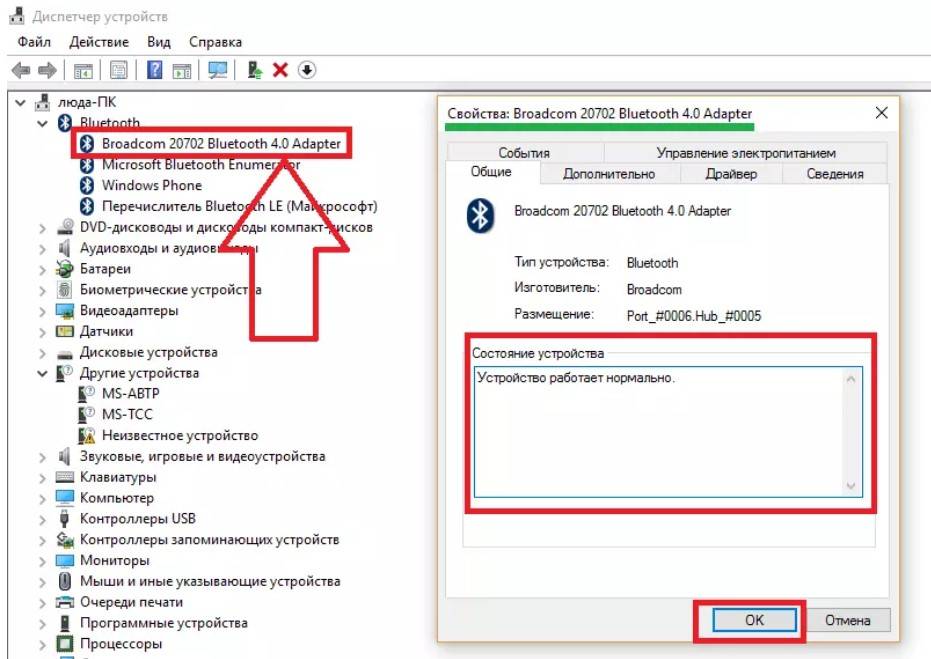 Шаг 1 – убедитесь, что устройство работает корректно. Для этого кликните на Блютус в списке устройств и откройте окно устройства